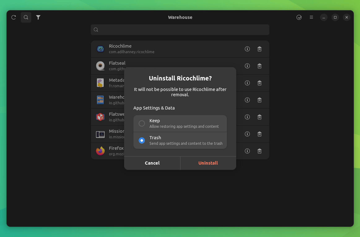 类似地,我可以点击“垃圾桶”图标,要么完全卸载 Flatpak 应用,要么为将来重新安装保留用户数据,并恢复设置/内容。