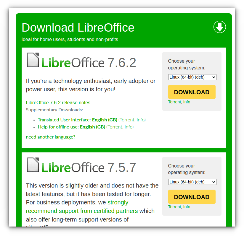 你可以随时前往 LibreOfiice 网站的下载页面 下载最新版本的 deb 文件。你还会看到下载较旧但 LTS 稳定版本的选项。