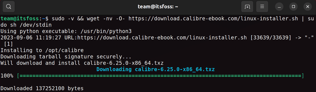sudo -v && wget --no-check-certificate -nv -O- https://download.calibre-ebook.com/linux-installer.sh | sudo sh /dev/stdin