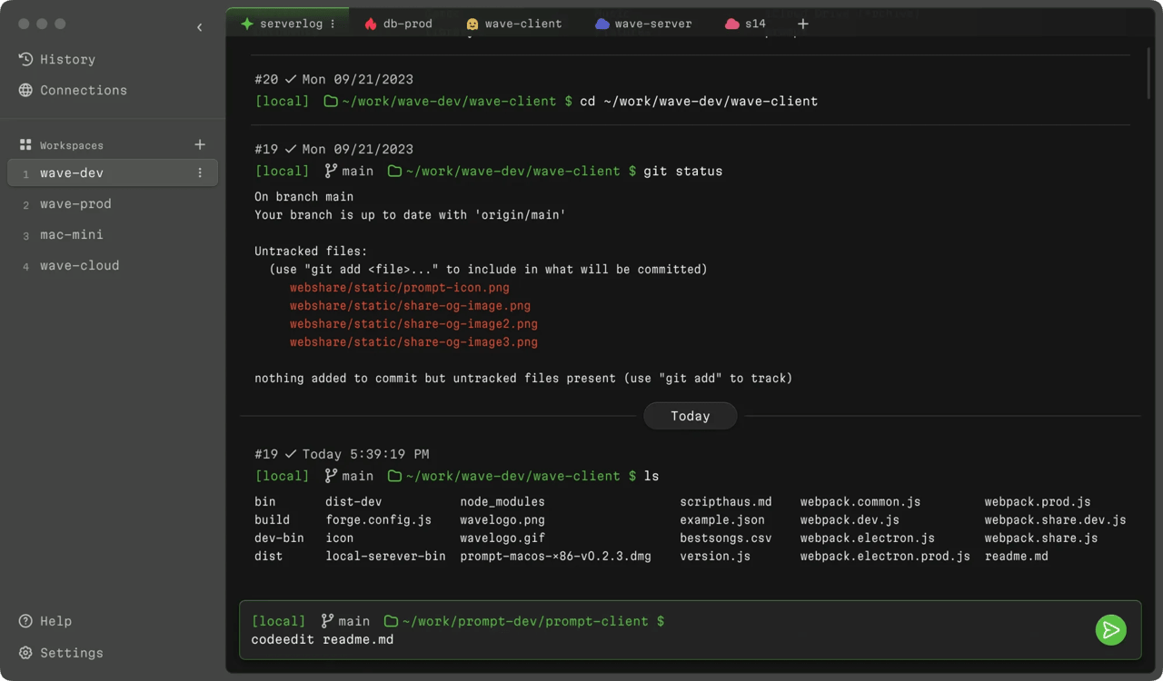 ? 保存并保持 SSH 连接持久化,把它们分组到工作区,并且在图形界面下编辑文件,这些都是一个开发者成为 Wave 终端粉丝的充足理由。