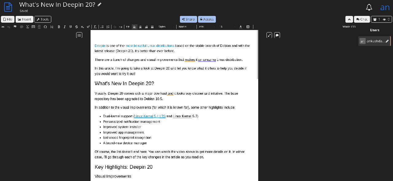 你可以在 Linux 和其他平台上免费使用其 桌面编辑器。你还可以选择自行托管社区版本并将其用作在线编辑器。但是,它确实对同时连接/用户有限制。