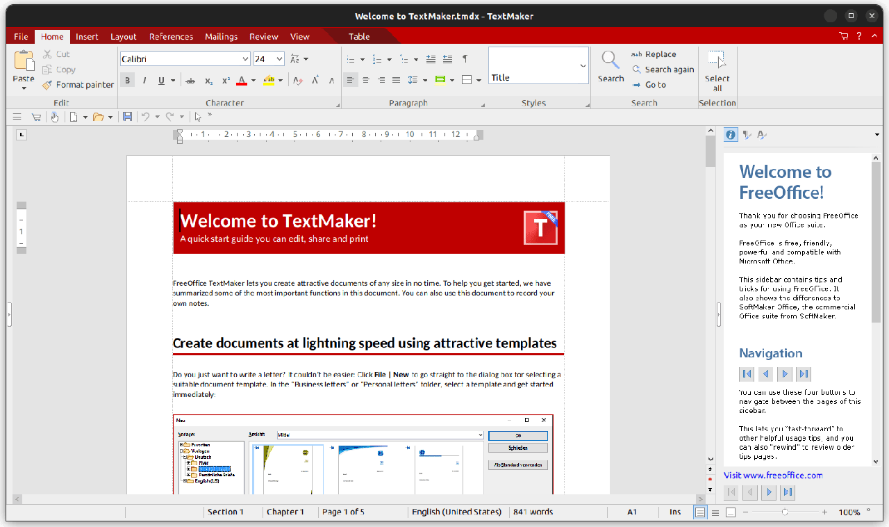 SoftMaker 的 FreeOffice 是一个适用于 Linux 和其他平台的专有文档套件。