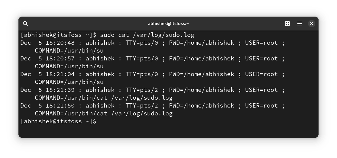 保存该文件后,便可以在其中查看哪些命令在何时、由哪位用户通过 sudo 运行了。