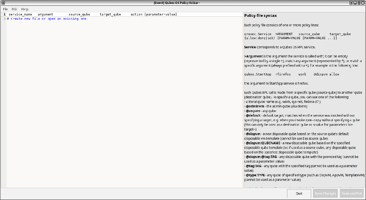 你在上面看到的是新的 Qubes OS 策略编辑器工具,它有一个非常简洁的界面,包含所有必需的选项。