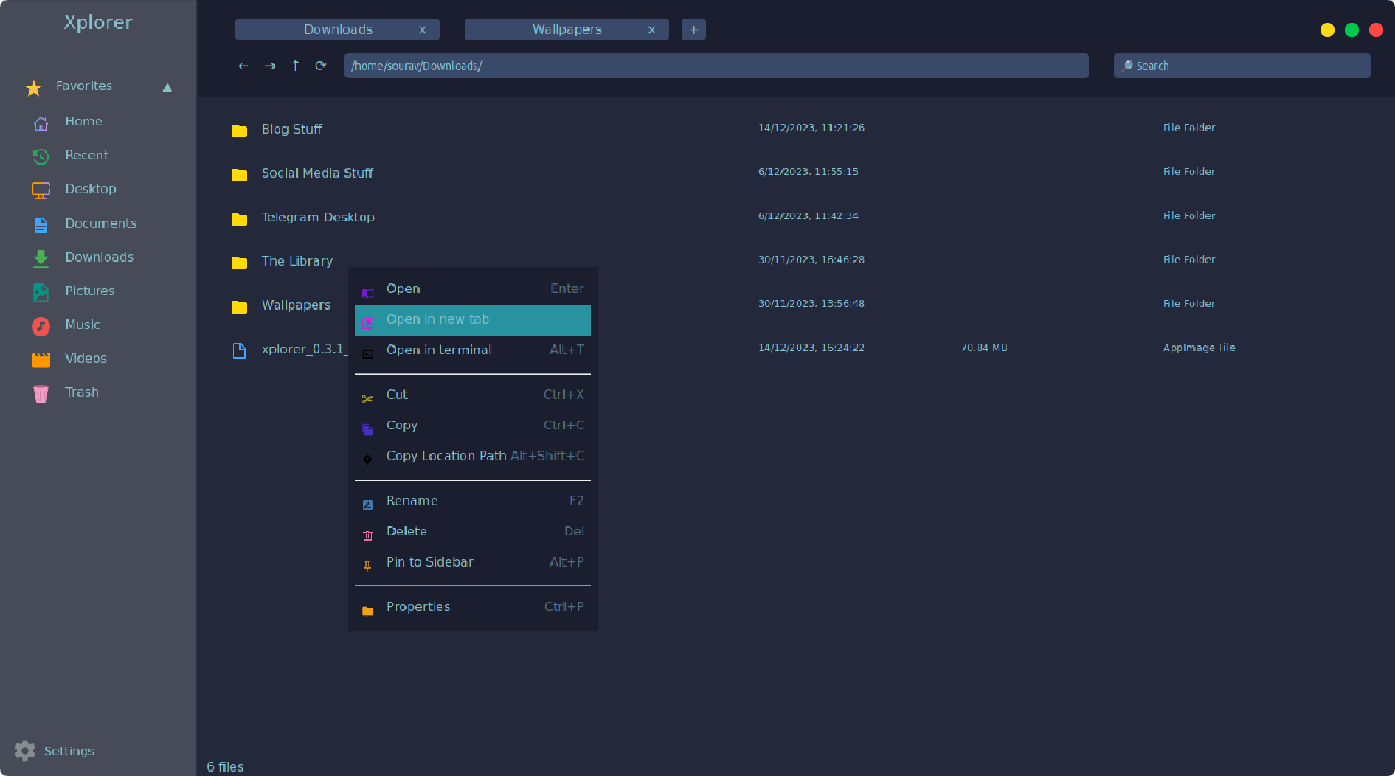 然后我继续检查多选项卡功能,它的工作方式正如人们所期望的那样。从上下文(右键单击)菜单中,我可以在一个新选项卡中打开 “Wallpapers” 文件夹,我可以轻松切换到该文件夹。