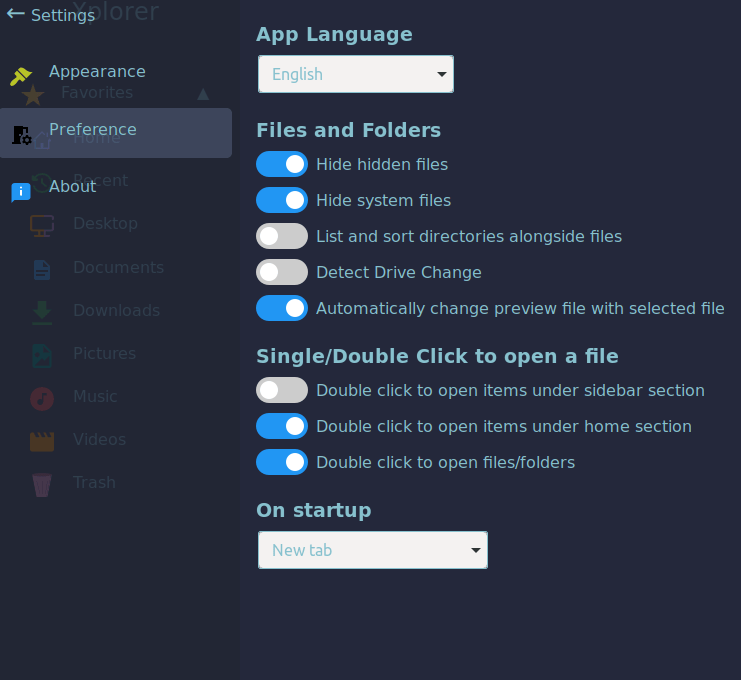 在“ 首选项 ”菜单下还有其他设置,你可以对其进行调整,以获得真正属于自己的使用体验。它有处理隐藏文件、系统文件、更改鼠标点击行为等选项。